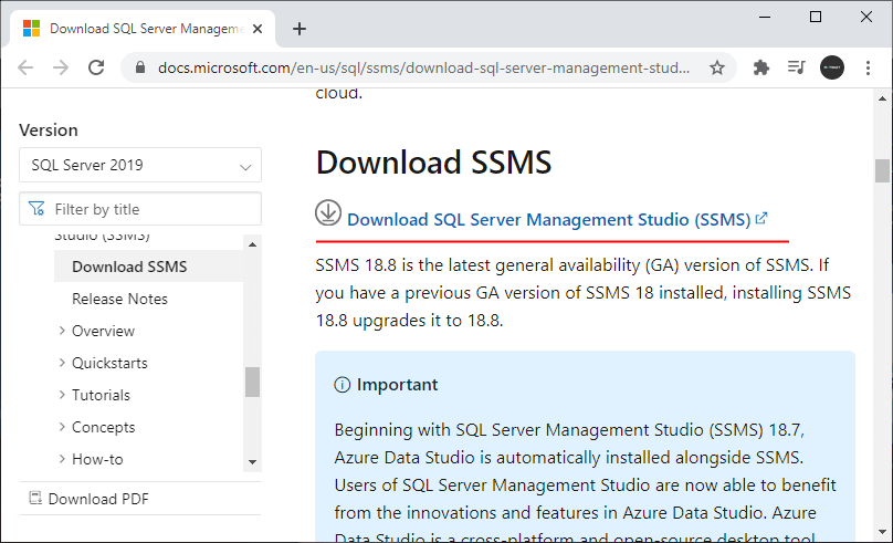 Чтобы установить SSMS, перейдем на страницу https://docs.microsoft.com/en-us/sql/ssms/download-sql-server-management-studio-ssms?view=sql-server-ver15. Найдем на странице ссылку на загрузку.: